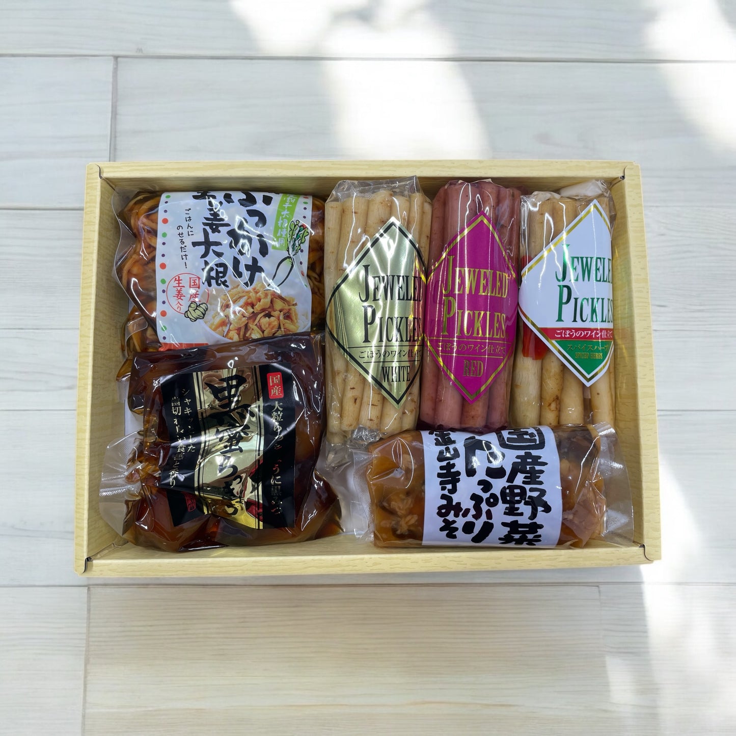 ★ジュエルドピクルスは、洗練された大人向けのヘルシーな贈り物としても喜ばれます 漬物をギフトやプレゼントとして贈りたい。 しかし、もっと華やかだったら・・・お洒落だったら・・・と思うことが、よくありました。 そこで、今回、お洒落なお漬物を開発し、これからは、ギフトやプレゼントでも、お洒落なお漬物を贈って頂きたいという思いもありました。 今までの漬物ギフトにはないお洒落さや華やかさを追求し、贈る側も受け取る側も喜ばれるような商品を目指しました。 和風なイメージを超え、お洒落で華やか、品格あふれる高級感のある漬物ギフトとして、幅広い年代の方々に喜んでいただけると確信しています。 是非、この特別な商品を活用いただき、目でも楽しめ、美味しさにも満足できる、これまでにない新しいお漬物の世界をご堪能ください。