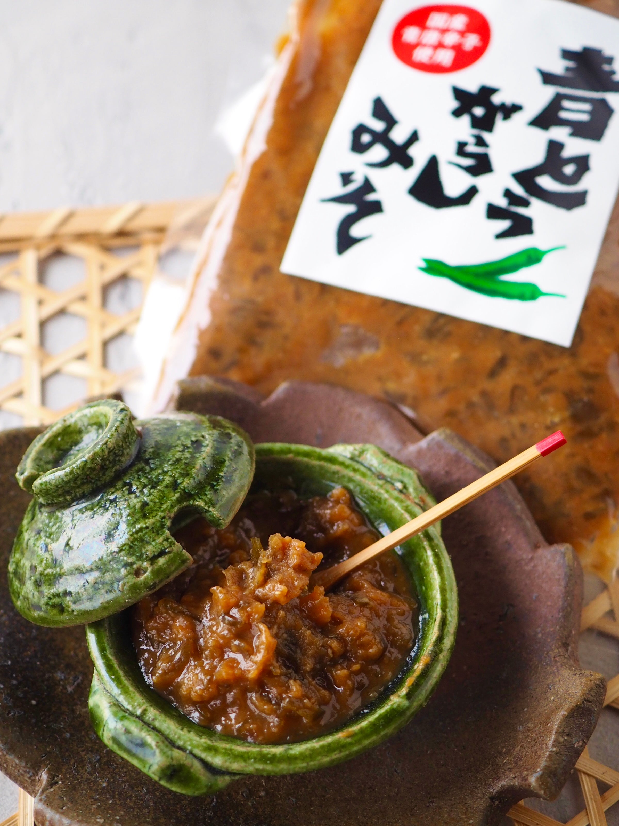 ピリッとした辛さが食欲をさらに増進させ、またおばねやの青とうがらしみそ食べたい、そう思わせる一品です。どの食材に対しても使えて、さらにその食材の旨味を増すことのできる、まさに万能味噌です。