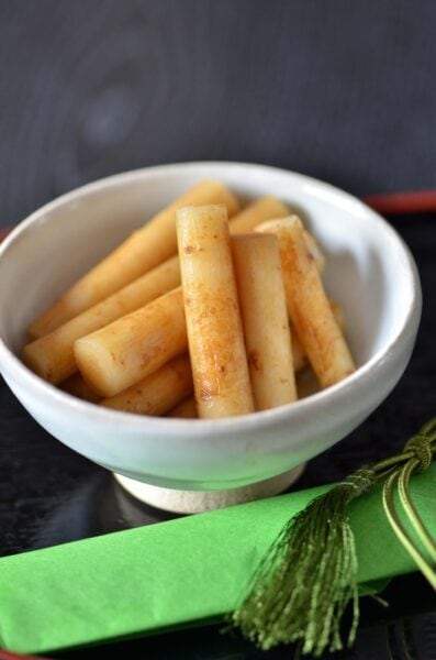 ごぼうの隅々まで、白醤油ベースの甘口かつお味が染みわたっています。
